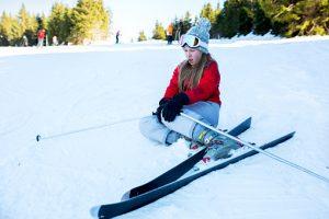 Quole speciaal voor mannen > Skiën en knieën, een innige relatie > Teenage ski girl holding her knee in pain after accident on ski slope.